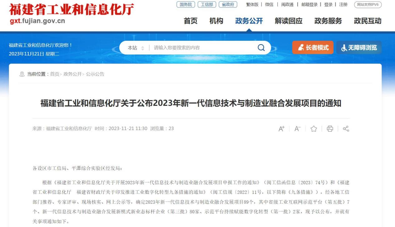 11月20日,福建省工业和信息化厅公布《2023年新一代信息技术与制造业融合发展项目》入选名单,经企业申报、各级工信部门推荐、专家评审、现场核实、社会公示等严格筛选程序,恒而达获评“新模式新业态标杆企业”荣誉,标志着我司推进本土制造业高端化、智能化、绿色化发展成果再一次得到了肯定!