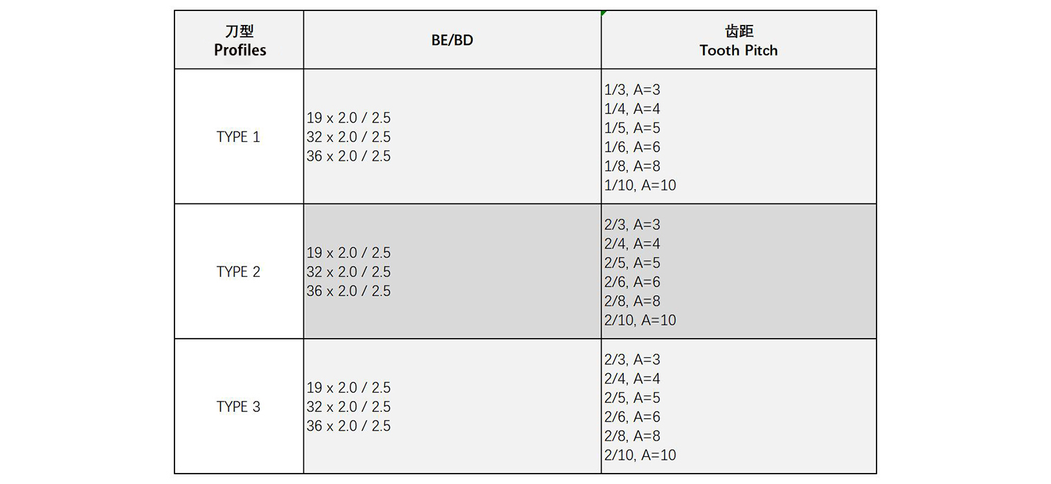 ①TYPE 1 19 x 2.0 / 2.5, Tooth Pitch 1/3, 1/4, 1/5;②TYPE 1 32 x 2.0 / 2.5, Tooth Pitch 1/3, 1/4, 1/5.