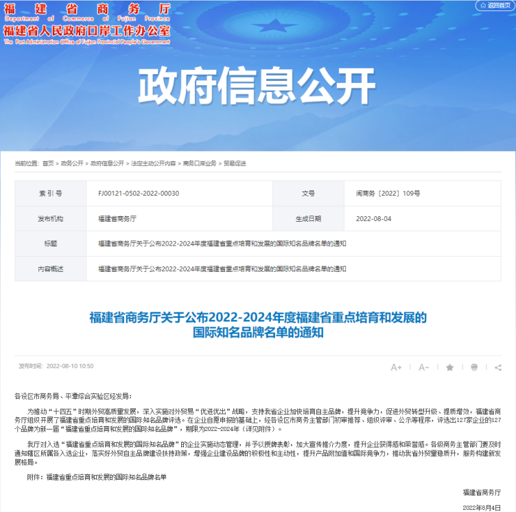 据悉,该项评定工作每三年开展一次,旨在深入贯彻落实国家“十四五”时期对外贸易“优进优出”战略,培育和发展一批具有较强国际竞争力的国际知名品牌,进一步转变外贸发展方式,推进福建省由外贸大省向外贸强省转变。根据《福建省商务厅关于开展“福建省重点培育和发展的国际知名品牌”认定工作的通知》要求,经各设区市商务主管部门初审推荐、组织评审、公示等程序,127家企业127个品牌被认定为新一届“福建省重点培育和发展的国际知名品牌”。