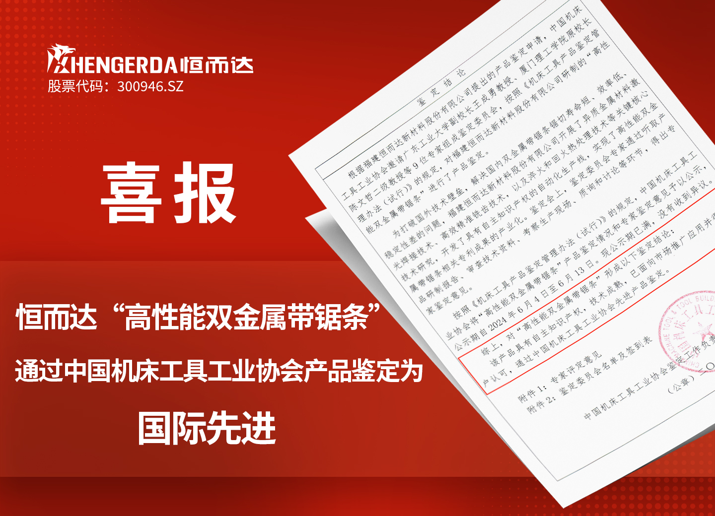 On June 18, 2024, we got the good news that Hengerda's “High-performance Bi-metal Band Saw Blade” had successfully passed the advanced product appraisal and public notice by China Machine Tool & Tool Builders' Association (CMTBA). The appraisal committee believes that the product has independent intellectual property rights and the overall technological level has reached the internationally advanced level.