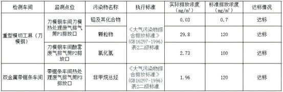 针对重型模切工具(刀模钢)酸洗工序生产过程中产生的废气,采用多面球填料吸收回收+碱液喷淋处理,达到《大气污染物综合排放标准》(GB16297-1996)表2二级排放要求。重型模切工具(刀模钢)热处理工序生产过程中产生的废气,采用滤筒除尘+多面球填料吸收+碱液喷淋+焦炭吸附+水喷淋处理,达到《大气污染物综合排放标准》(GB16297-1996)表2排放要求。双金属带锯条热处理工序油烟废气采用油雾净化器进行处理,达到《大气污染物综合排放标准》(GB16297-1996)表2排放要求。