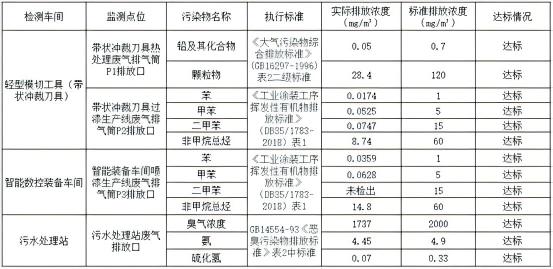 轻型模切工具(带状冲裁刀具)热处理工序生产过程中产生的废气,采用滤筒除尘+碱液喷淋+焦炭吸附+水喷淋处理,达到《大气污染物综合排放标准》(GB16297-1996)表2二级排放要求;轻型模切工具(带状冲裁刀具)过漆工序废气采用UV光解设备进行处理,达到《工业涂装工序挥发性有机物排放标准》(DB35/1783-2018)表1中排放要求;智能数控装备项目喷漆工序采用活性炭吸附+UV光解设备进行处理,达到《工业涂装工序挥发性有机物排放标准》(DB35/1783-2018)表1中排放要求;污水处理站产生的恶臭气体采用活性炭吸附进行处理,达到GB14554-93《恶臭污染物排放标准》表2中标准排放要求。