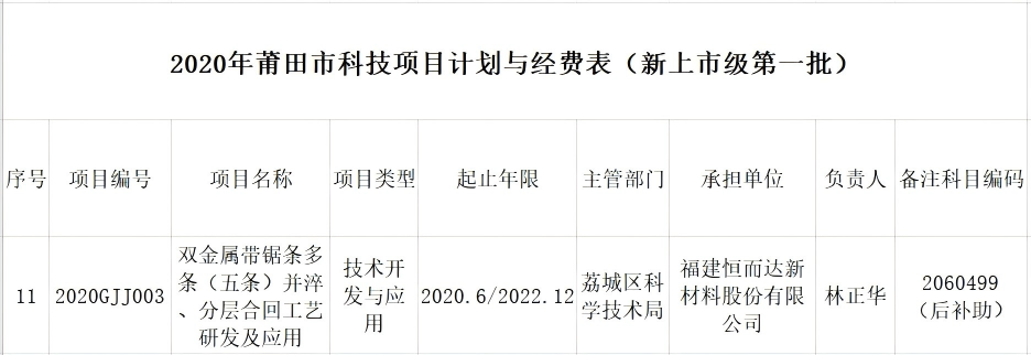 2020年07月06日,莆田市财政局和莆田市科学技术局发布关于下达2020年莆田科技项目计划和经费的通知,我司组织申报的《双金属带锯条多条(五条)并淬、分层合回工艺研发及应用》列入2020年莆田市科技项目计划,该项目是公司自主创新并独立承担的研发任务。