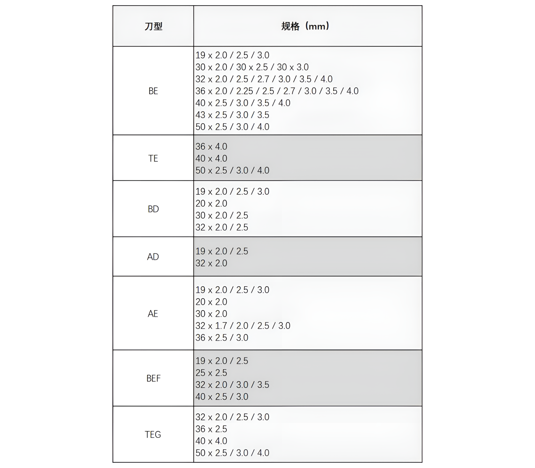 BE,BD,AE,TEG,TE等为刀模钢产品中的常规款型,广泛应用于鞋类箱包的生产制造。我司亦生产BEF, BFG, BES及AD等刀型,品类丰富;刀尖及刀身配有不同硬度,折弯性能卓越,使用寿命长,可适应不同应用场景。更多规格请参考下方列表,如需定制,请联系销售人员。